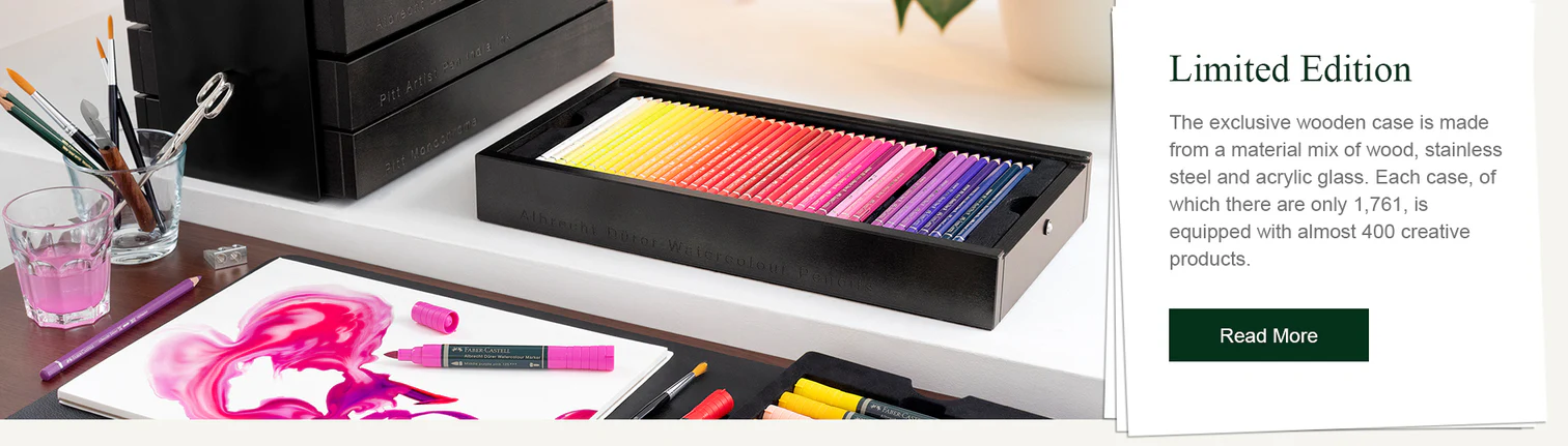 Faber-Castell manufactures artist materials of unique quality worldwide. The range for discerning artists now presents a new edition: the exclusive wooden case is made from a blend of wood, stainless steel, and acrylic glass. Thanks to the special wood grain and the affixed serial number, each case, limited to 1,761 pieces, is unique.